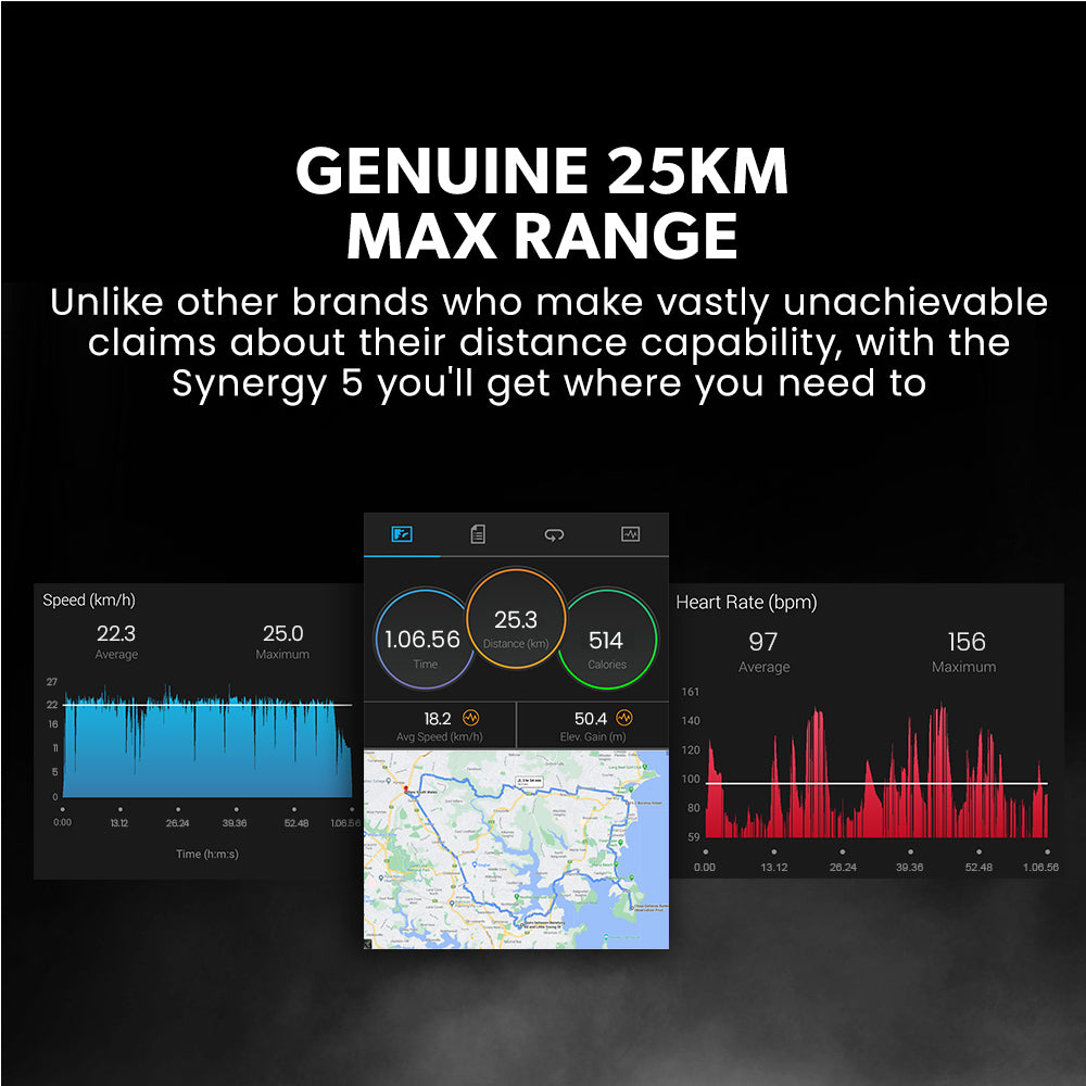 Despite a massive battery system and a heavy-duty motor, the Synergy 5 weighs in at a reasonable 12.5kg thanks to a premium aluminium frame. The frame boasts superb torsional strength for optimal handling and to prevent breakages that other models experience.